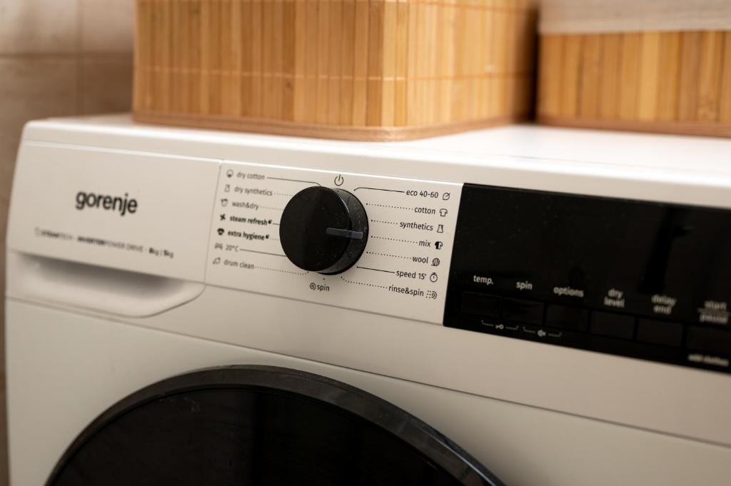 Refrigerator, Washing machine, Kitchen, Electric kettle, Dryer, Oven, Stovetop, Cleaning products, Coffee machine, Dining table, Wine glasses