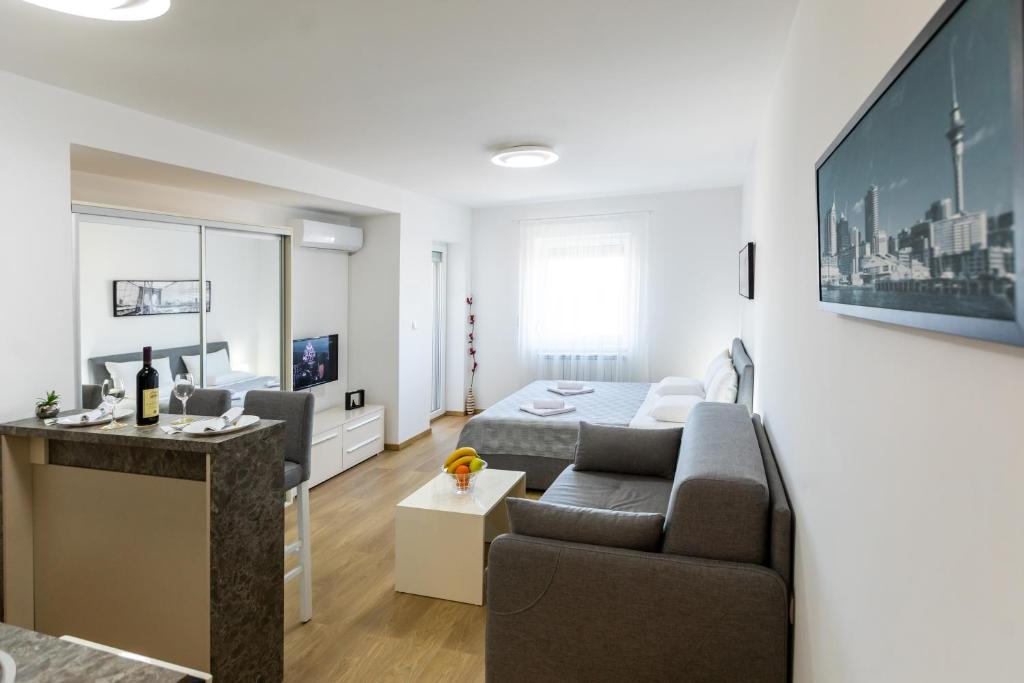 Featuring a private entrance, this air-conditioned apartment consists of 2 living rooms, 1 separate bedroom and 1 bathroom with a shower and a hairdryer. Meals can be prepared in the kitchen, which is equipped with a stovetop, a refrigerator, a dishwasher and kitchenware. Boasting a balcony with city views, this apartment also provides soundproof walls and a flat-screen TV with satellite channels. The unit offers 2 beds.